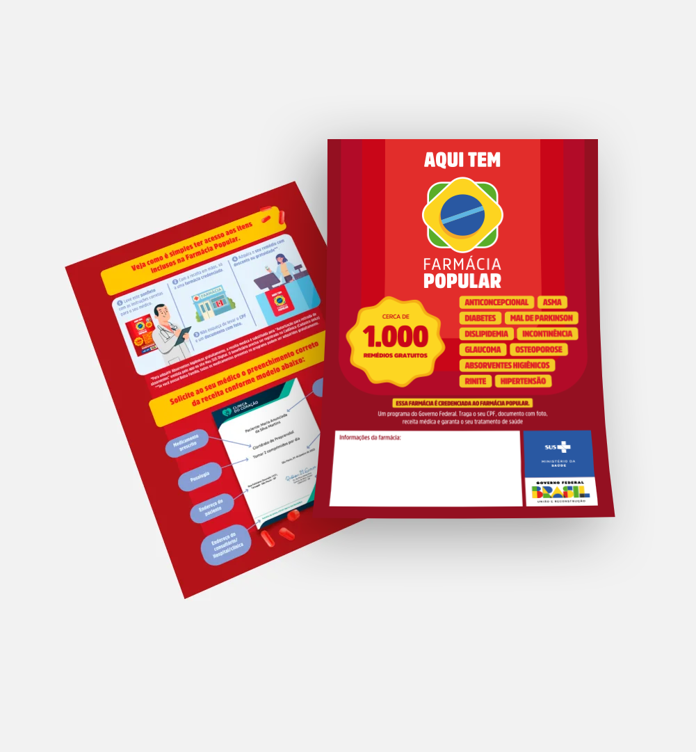Os panfletos são uma ótima forma de divulgar o Programa Farmácia Popular e a sua farmácia credenciada. Eles possuem informações importantes para o público em geral, informando as patologias as quais o programa disponibiliza medicamentos, a documentação necessária para retirada dos medicamentos e o preenchimento correto do receituário médico. Além disso, eles também aguçam a curiosidade do seu cliente sobre os outros medicamentos que são distribuídos gratuitamente. Os panfletos seguem todas as normas estabelecidas pelo Ministério da Saúde e do Governo Federal.